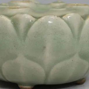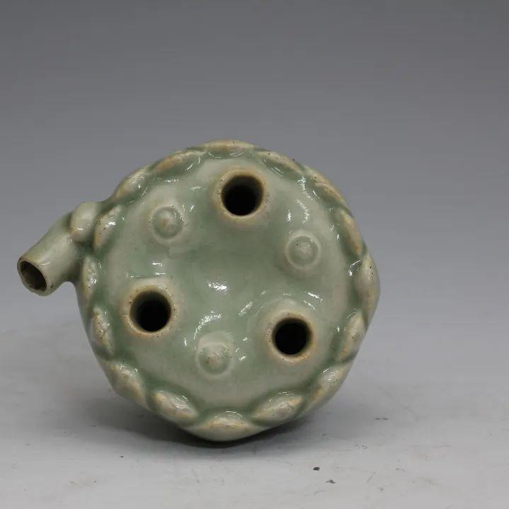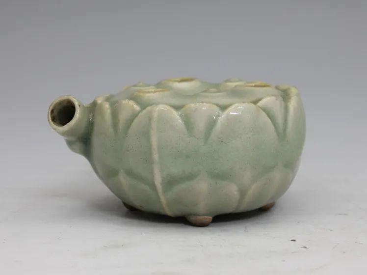北京艺术博物馆藏青白釉莲蓬形砚滴,造型以莲蓬为基础,顶部刻划三颗莲子,间隙以三孔为入水口。外壁饰以三重莲瓣纹,一侧有短流,为出水口。整器施以青白色釉,青翠润泽,似刚刚采摘的莲蓬。置于书房案头,用来滴水研墨,成为一道靓丽风景。