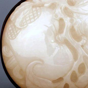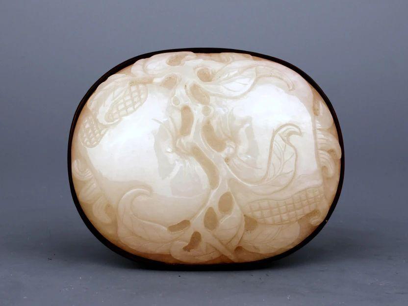 馆藏清白玉榴开百子图镶件即表现石榴成熟、裂开露出石榴籽的样子。整件镶件为椭圆形镶嵌于木托之中。嵌玉部分为白玉质泛青,玉色均匀,玉质纯净。以浅浮雕和阴线刻手法琢榴开百子图。画面正中为一根叶片卷曲的枝条,枝条上一左一右各长着一只大石榴,两只石榴颠倒而置,口已裂开,露出饱满的籽粒。