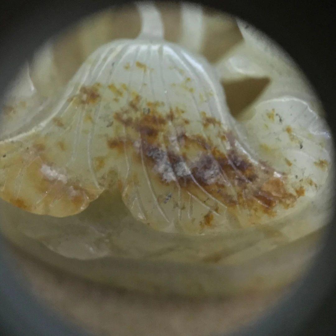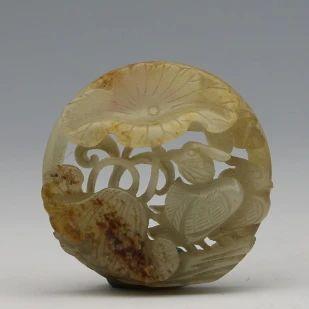 在玉饰左上,是一片大大的荷叶,似在为两只鸳鸯遮蔽,下侧巧雕一片荷叶已然枯萎卷曲,佩以玉色本身的褐色。表现的正是一幅入秋时节荷塘鸳鸯的景色。