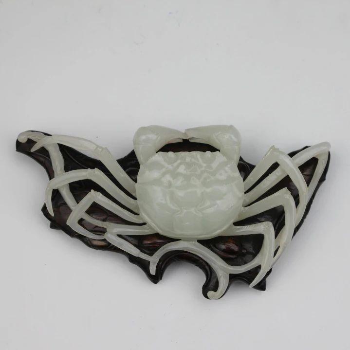 明清时期,螃蟹的寓意得到升华,成为文人绘画和工艺品雕刻的重要题材之一。馆藏清代白玉蟹,以一块白玉料圆雕而成,并附有木座。螃蟹整体呈伏卧爬行状,双螯合置于身体前端;蟹腿一侧舒展一侧蜷缩作爬行状,左边的蟹腿处镂雕一根细长芦苇叶。蟹壳上缘凸雕螃蟹的圆眼睛,表面琢制出凹凸不平的质感,腹部以阴刻线琢刻蟹的嘴和尖脐,蟹螯、蟹腿、蟹壳背面均施以一组组短阴刻线表示蟹的绒毛。整体琢刻极为写实。螃蟹与芦苇叶组合,表示“二甲传胪”,寓意考取科举功名的美好愿望。