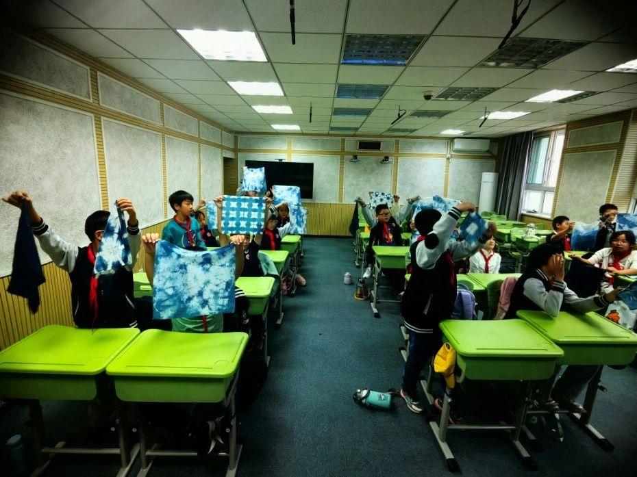 在这次活动中,专业的蓝染专家为同学们举办一场讲座,详细介绍了蓝染的历史、技法和文化意义。接着,在场的同学们亲自体验蓝染染色的环节。艺博老师将准备好蓝染工具和材料,在专家的指导和帮助下,让每个同学都看到了“青出于蓝胜于蓝”的全过程。