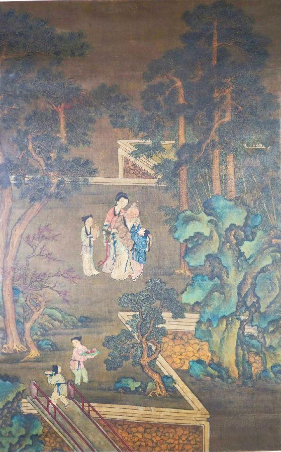 此幅青绿风景人物画,用细腻的笔触,描绘了六位家庭成员和睦相处、孝敬老人的仪态,体现了幸福美满的齐家之道,弘扬了养亲、敬亲、尊亲的敬老文化。