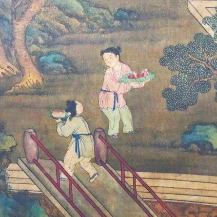 另有粉衣女童端着盛有石榴、柿子的荷叶盘,绿衣男童端着盛有寿桃的蓝釉盘走向老者敬献。画面背景有苍松翠柏,寿石竹林,以及花树点辍。