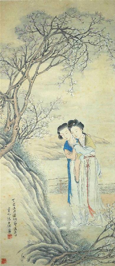 馆藏《簪柳图》,画面绘清明时节,郊外梨花吐蕊,岸边土坡旁,踏青赏春的女子。其中一人梳倭坠髻,流珠柳簪斜插在发髻间,她身旁的侍女梳双丫髻,右耳边插朵花柳簪。