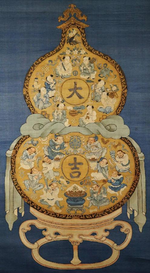 画面构图简洁写实,以金线、银线、香色、湖色等色调沉稳的绣线搭配,与蓝色地形成对比,主题突出,物象分明。画面主体是葫芦,葫芦的上下两处开光内书“大”“吉”二字。“大”字外有八位童子各执八仙法器——芭蕉扇、葫芦、花篮、玉板、洞箫、莲花、渔鼓、宝剑,间饰如意、金鱼、方胜、荷花、古币、海螺、宝伞、盘常等吉祥图案。“吉”字外饰胡人献宝图。边饰金线唐草纹,顶部饰倒悬蝙蝠、石磬,嘴部饰喜鹊登梅;腰部系灰绿色绶带。圆形有束腰四足内卷带托泥底座,雪青色四季花卉绫裱边。