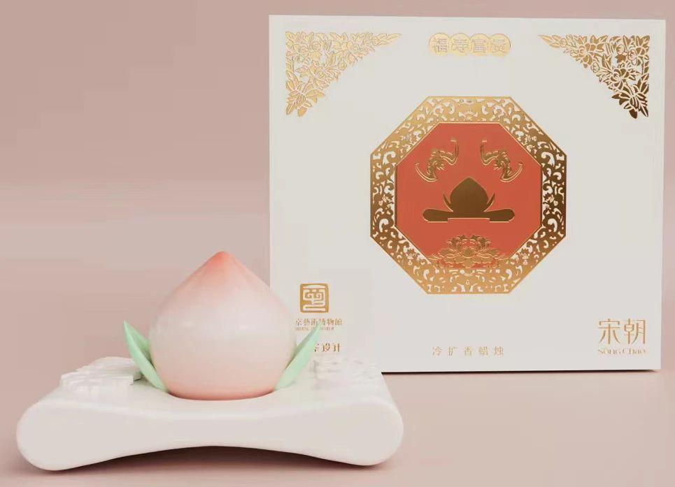 福寿富贵冷扩香蜡烛,以艺博馆藏文物清代木雕福寿如意墨床两侧蝙蝠纹和牡丹纹为元素设计底座,寓意“福寿富贵”,也是对生活的美好寄望。