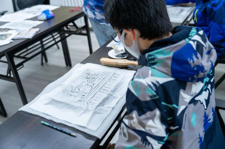 活动期间,青少年们在博物馆老师的指导和讲述下,学习了传拓的历史,动手体验润纸、敲打、拓墨、揭取全过程,最终收获一张张自制的拓印作品。