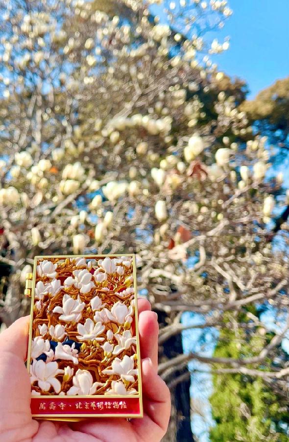 特别是北京博物馆月十大优质文创推介”产品之一“金玉满堂”开合冰箱贴设计元素取自万寿寺一、二进院的玉兰花。花开耀眼与古建红墙相得益彰,花叶舒展而饱满,花香飘逸,古韵十足,具有很高的观赏价值,玉兰花的设计不仅增强了与观众的情感链接,而且传播了美学和情感价值。