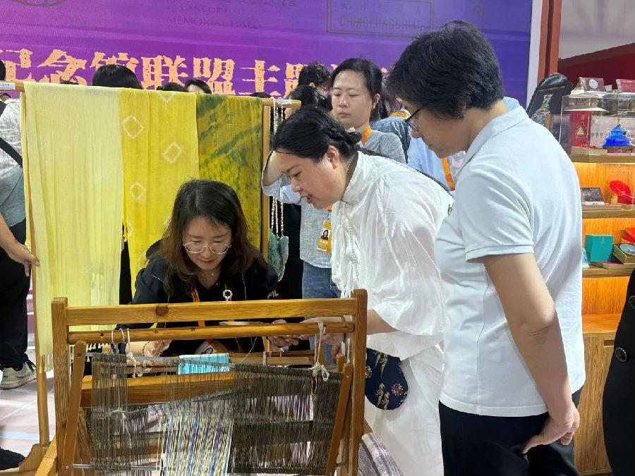 服贸会期间除了文创产品外,我馆还安排了精彩的互动活动,由女工坊老师进行扎染成果展示和传统纺织技艺展示,展示作品源于天然纤维、自然的色彩能够与北京艺术博物馆内元素相结合,精美绝伦。传统纺织技艺、利用手工纺织机,感兴趣的观众,在女工老师的指导下,积极参与,上手体验,在传统纺织的过程中,寻求本真与灵动之美,力求材质、色彩与技法的和谐统一。