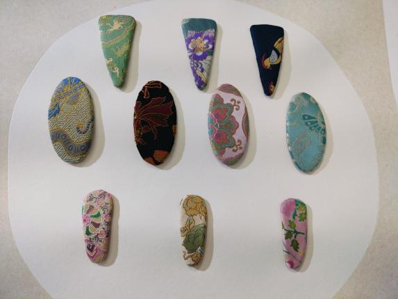以宋锦为例,老师通过讲解宋锦的历史文化背 景、制作工艺及特点,让参与者了解宋锦这一非物质文化遗产的独特魅力,引导大家将这一传统元素融入现代饰品设计中。参与者可以学习如何裁剪、拼接纺织,并搭配其他材料(如珠子、蕾丝等)制作出既传统又时尚的发卡。