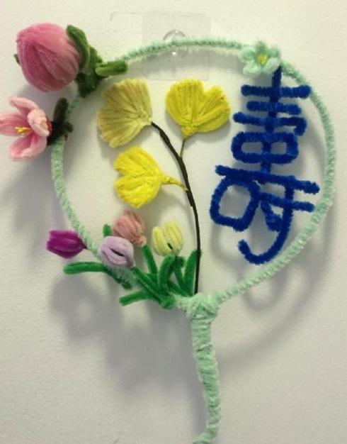 作品说明:团扇主体是寿桃+寿字,源于吉物永寿展的”斗彩灵仙祝寿图盘的寿桃及寿字中间配了一枝金色银杏。金秋时节御碑亭东西两侧的银杏树,满树金黄时的美好。“银为有你,三生有杏”最下方配了几枝郁金香 ,感觉那一片盛开的郁金香赋予了万寿寺灵动,活力与美好!