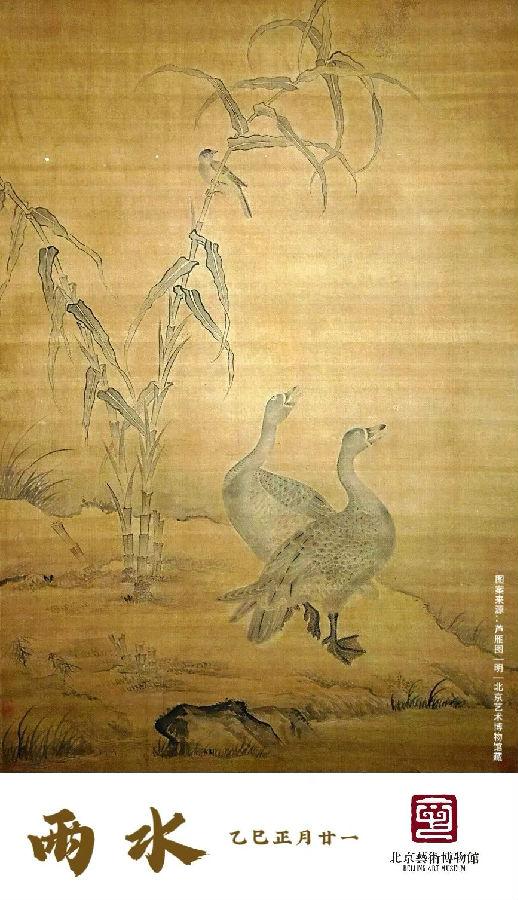 春始属木,然生木者必水也,故立春之后继之雨水。雨水三候:一候獭祭鱼,二候鸿雁来,三候草木萌动。冬去春来,大雁北归,是中国传统绘画所喜爱的题材。馆藏这幅绘于明代的《芦雁图》,描绘了两只曲颈昂首望向天空的大雁在溪水边休憩的场景。双雁身侧绘萌发的芦苇,长势旺盛,春意盎然。