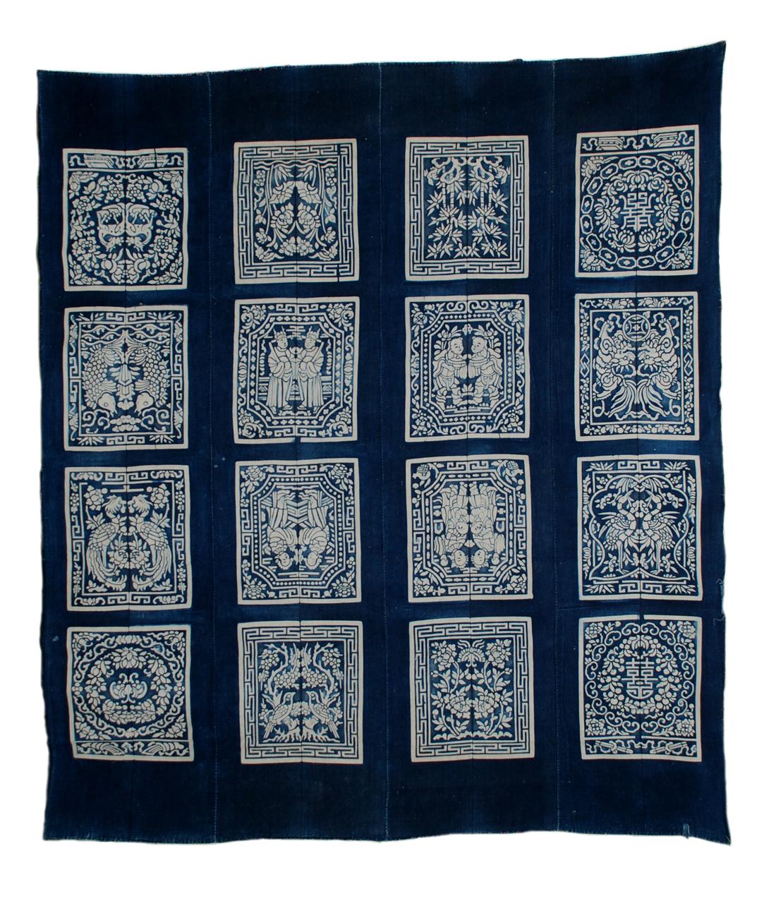(福禄寿喜纹蓝夹缬棉布被面,清代)