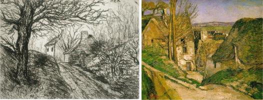 荣金德是荷兰早期印象派的重要画家、版画家。他描绘的海景具有早期印象派风格,他是最早运用点画笔触造型的画家,至少要比前面提到的毕沙罗早15年。实际上并不是每位印象派大师都擅长版画制作,印象派注重色彩与光线,而雕刻版画在色彩上是受局限的。莫奈一生就没有成功制作出一副版画,但是他的名作《印象·日出》(左图),灵感就源自于容金德的这张版画《在安特卫普港》(右图),表现的是安特卫普港的落日风景。莫奈看到这幅版画作品后,以自我的手法重新创作了《印象·日出》,成为艺术史上不可缺的伟大作品。加歇是一位精神科医生,与许多印象派画家都有交情,他既是画家毕沙罗和塞尚的朋友,本人还是一位热衷绘画的业余艺术家。他的作品本身并不出名,但作为艺术家的朋友,他却不可忽视。这幅《吊死者之屋》(左图)与塞尚的一幅作品同名(右图),本次展览中还展出了一幅塞尚所绘的《加歇医生之家》,足见加歇与画家之间的情谊之深厚。