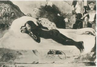 版画也在塔希提土著的题材上大做文章,通过岛上的原始生活不断地探索着同一个主题:我们从哪里来?我们是谁?我们去往何处?《死者的灵魂注视着(毛利妇女)》画中的土著少女别扭地卧在床上露出惊恐的脸。象征死者灵魂的都巴罗在少女头部的上方闪着磷光,传达出死者的灵魂与活人的灵魂的对接。