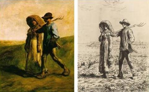 说起普通人的生活,特别是乡村的农活场景,就不得不提到米勒。米勒是巴比松画派中的栋梁,也是痴迷版画的一位画家。《拾稻穗》、《晚祷》都是他的代表作。《出工》(右图) 是他创作的最大的一幅版画,与同名油画(左图)相映成趣,尤为精彩。画面中两位农民正背着农具准备开始田间劳作。画面中的人物衣衫褴褛,显得疲惫不堪,这样的情景以黑白的形式展现出来,更加强化了现实感与视觉冲击。