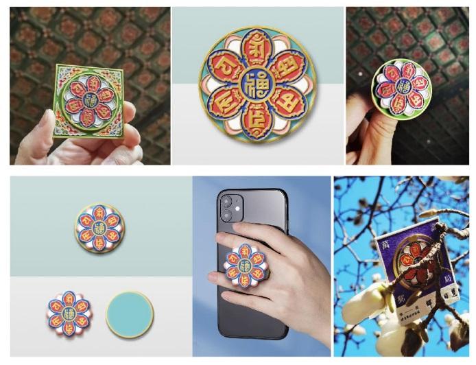 作品提取博物馆大殿顶部的福字天花彩绘,设计冰箱贴、车载香薰、手机支架、挂画、书签等产品,将纹样的不同造型以独特的创意方式或形式加载于产品之中,与其融合为一体,成为特定文化内容主题的文创产品。当游客看到优质的文创产品时,会受到文化的视觉冲击力,感受到博物馆的文化气息。使其具有设计价值,以此提升文化元素的传播力。