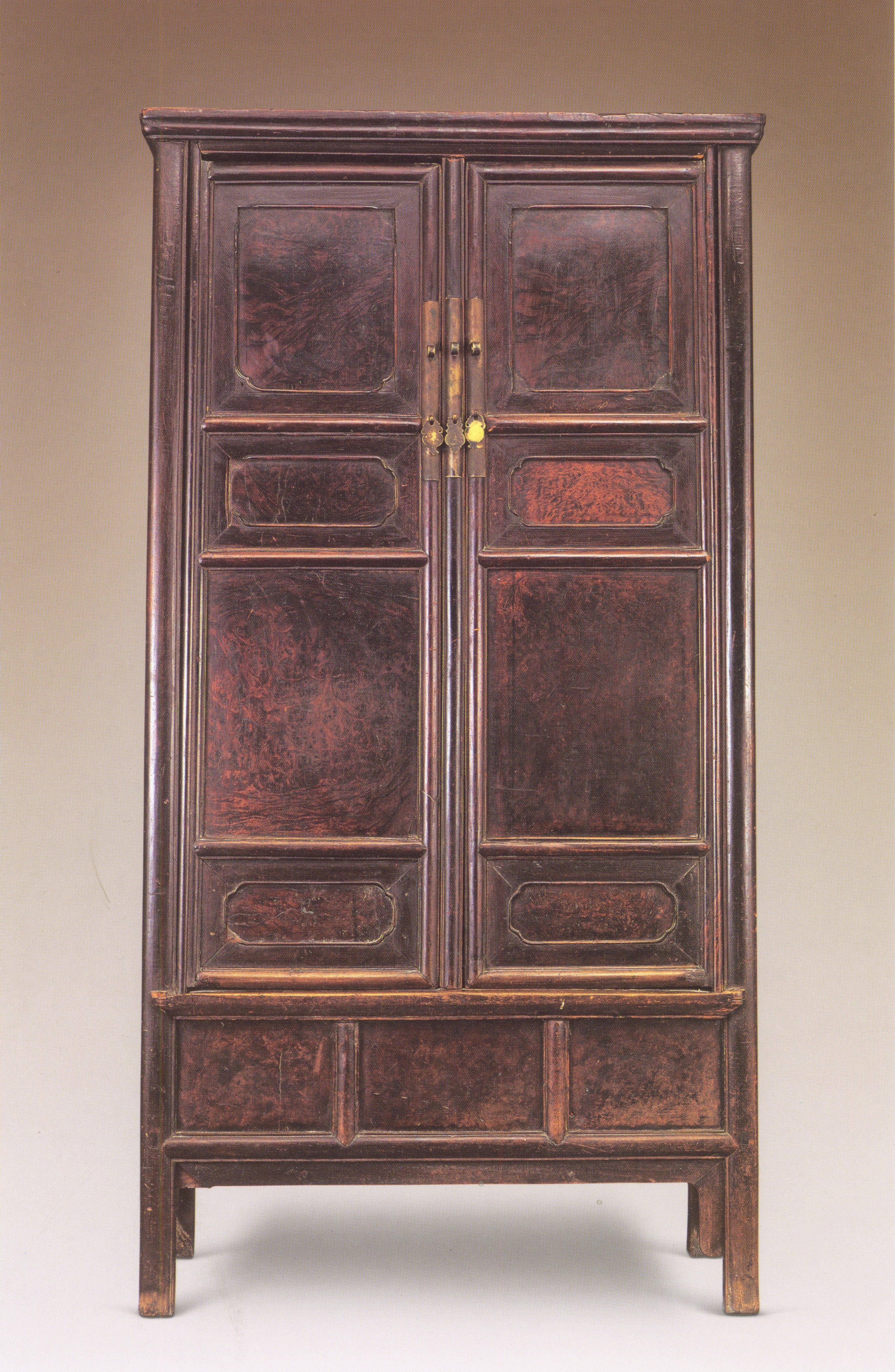 亮格柜是架格和柜子相结合的家具,常见的形式是架格在上,柜子在下。圆角柜因其柜顶转角为圆而命名。柜顶前、左、右三面有小檐喷出,名曰“柜帽”。柜帽的转角,多削去硬楞,成为柔和的圆角。方角柜则四角见方,上下同大,腿足垂直无侧脚。