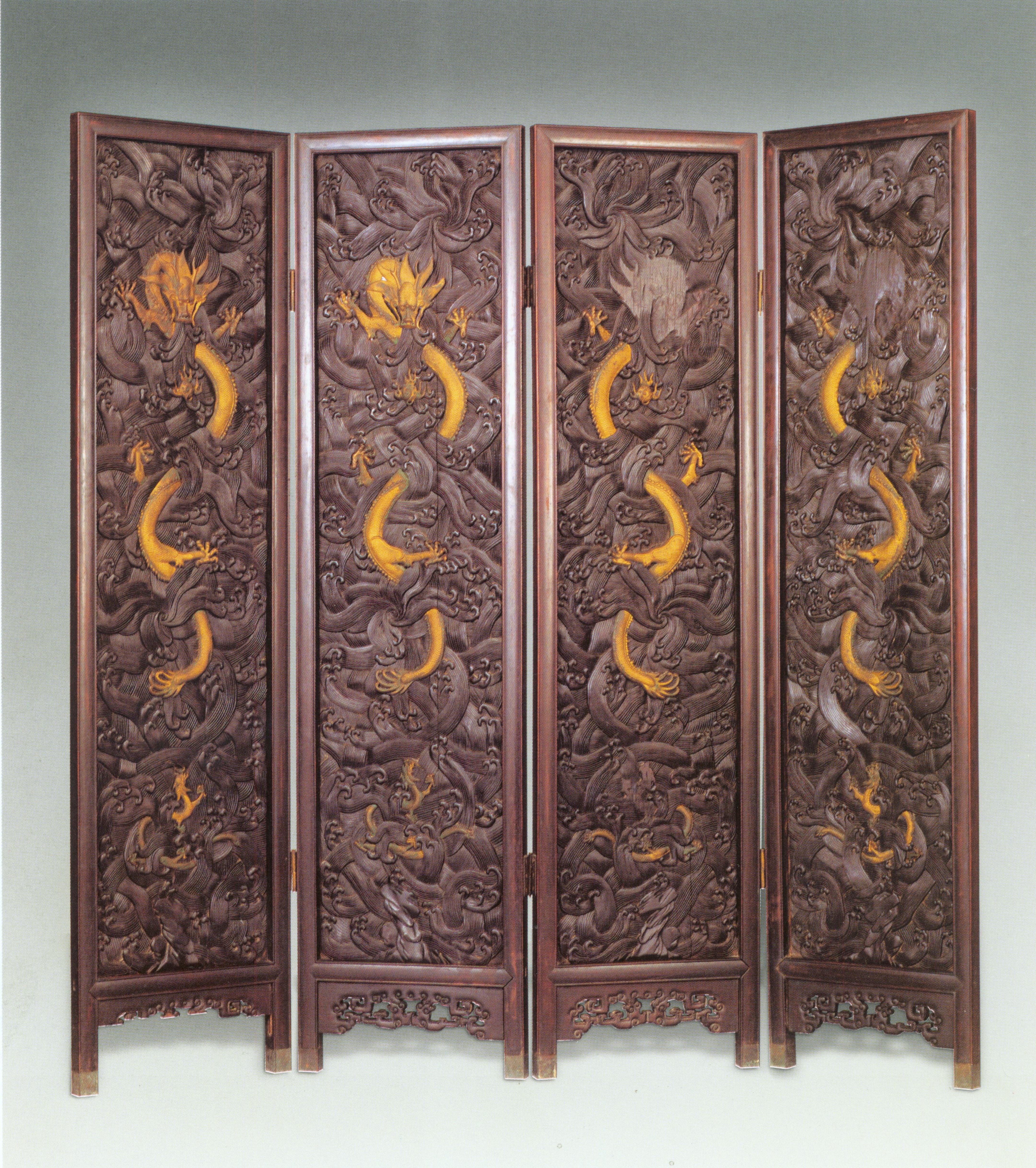 紫檀雕海水江崖嵌铜鎏金龙纹四折围屏