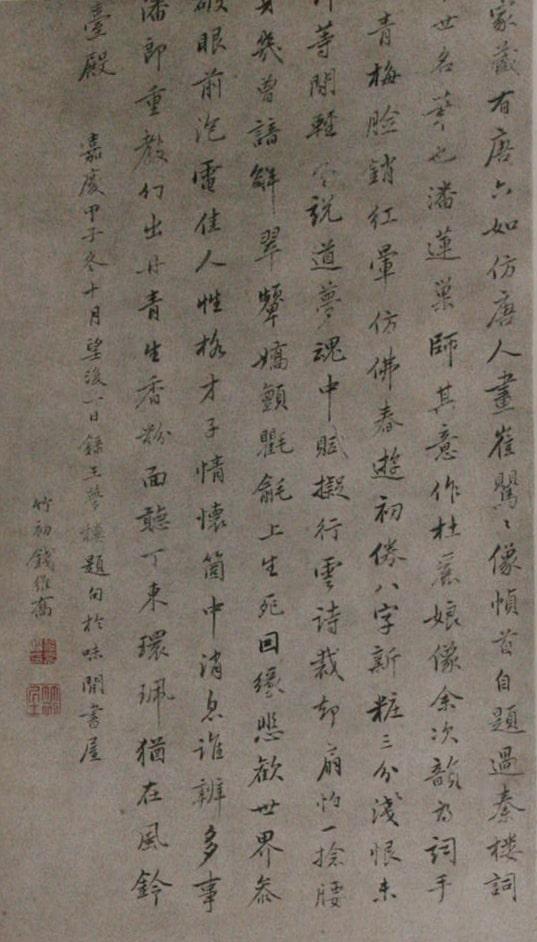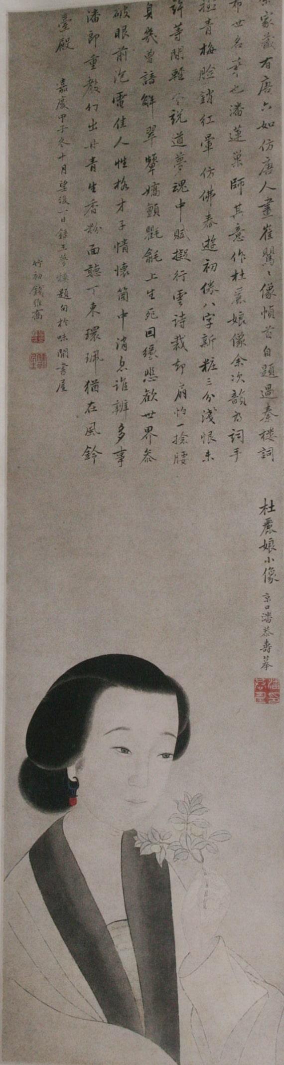 清代,在画上题字赋诗是常见的艺术形式,不同的绘画主题上所题的诗句目的和功能也各不相同,例如有题在山水画上的,起到挖掘画境,拓展画面的作用;也有题写在人物像上的,品评人物,抒发情怀的;也有为他人画作题写,用来赞美画技,称颂作者的等等。这件作品画面上题:余家藏有唐六如仿唐人画崔莺莺像,帧首自题过秦楼词,希世名笔也,潘莲巢师其意作杜丽娘像,余次韵为词:“手撚青梅,脸销红晕,仿佛春游初倦,八字新妆,三分浅恨,未许等闲轻风,说道梦魂中,赋拟行云诗。裁却扇,怕一捻腰身,几曾谙解,翠颦娇颤,上生死回缘,悲欢世界参破眼前泡电,佳人性格,才子情怀,个中消息谁辨。”多事潘郎重教幻出丹青,生香粉面听丁冬环佩,犹在风铃台殿。嘉庆甲子冬十月望后一日錄王梦楼题句于味闲书屋。从钱维乔的题字里我们可以看出,因为钱维乔家里藏有唐伯虎自题诗的画作《崔莺莺像》,便让潘恭寿仿照唐伯虎的笔意创作了这幅作品,并摘抄了王梦楼(王文治)的词题写在画上,同时赞美了潘恭寿的画技——仿佛人物幻象重生,依稀能听到美人环佩叮咚的声音。
