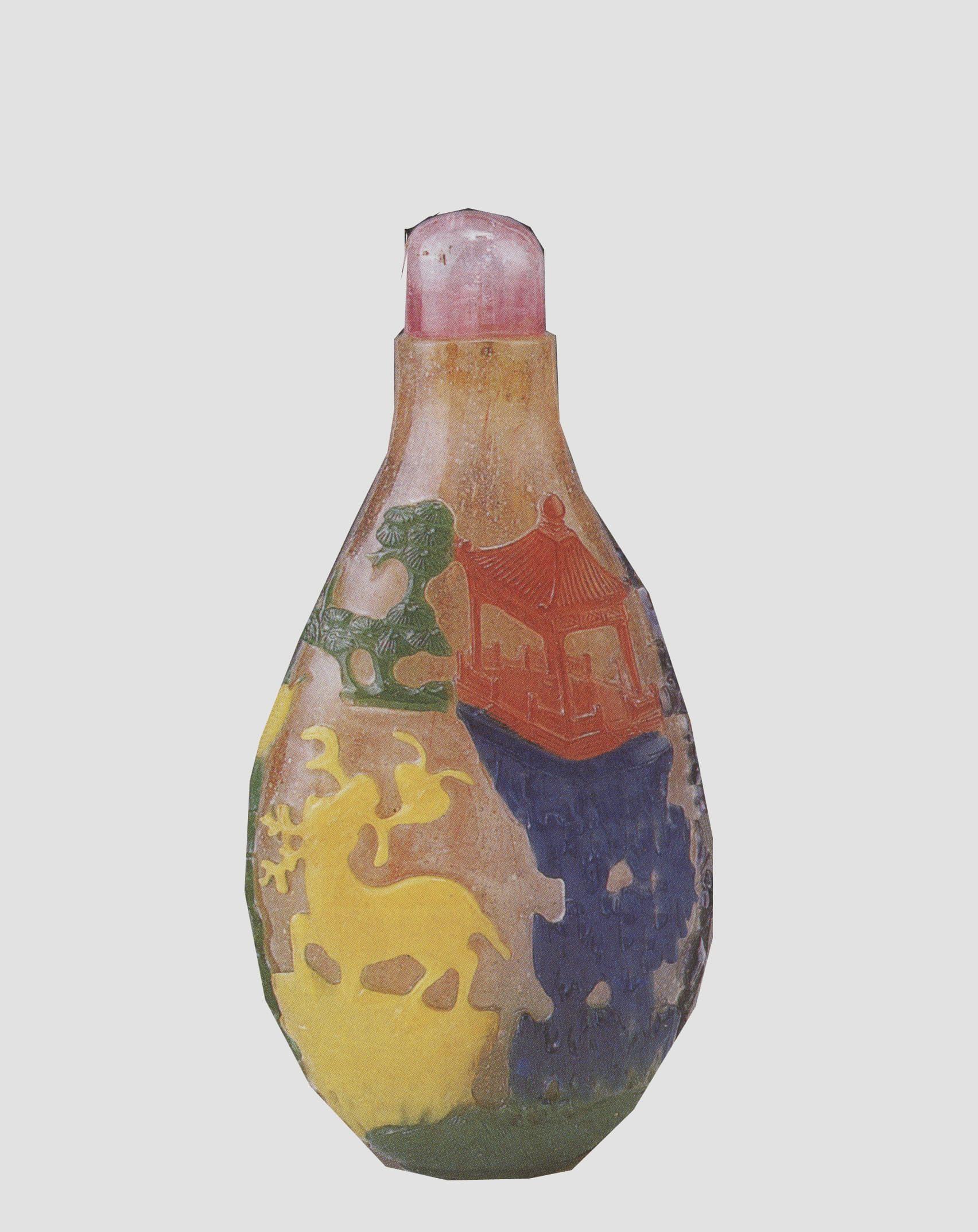 玻璃胎,在半透明玻璃上套红、黄、蓝、绿、紫五色玻璃。壶长颈、斜肩,矮圈足,上配粉色碧玺盖。一面腹部雕绿色荷叶,其绿色蔓枝向上伸至肩部。左侧是用紫色玻璃雕刻成的一棵高大的梧桐树,树下站立一只口衔灵芝的仙鹤,与另一面口叼灵芝的鹿构成“鹤鹿同春”的图案。此壶色彩丰富,构图饱满,寓意吉祥。