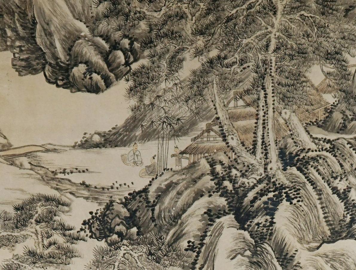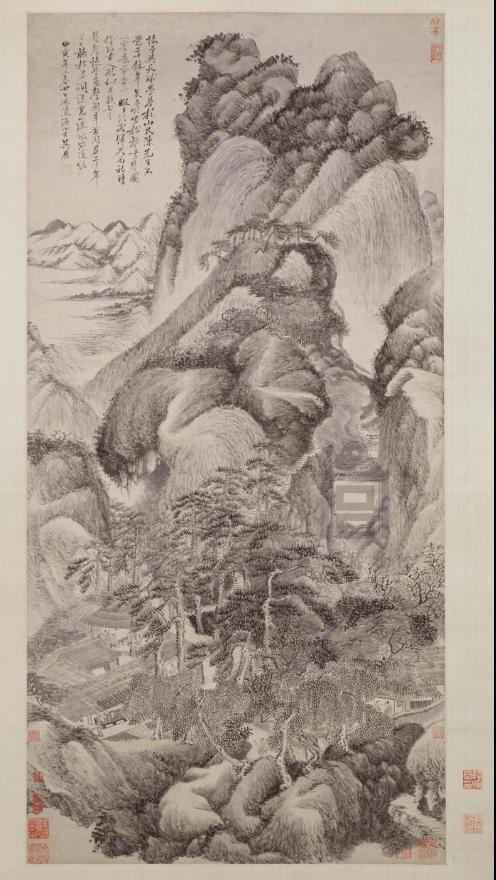 画面描绘重山叠嶂,山林莽莽,楼台隐于山中,山下有茅屋林舍数间,溪边桥旁、丛竹下主客两人席地而坐,一童子从茅屋内缓缓走出,携琴而立,似乎主人将要抚琴待客,共徜于山水之间。画右上方有吴历自题:“流水闲过岳麓西,几重树色隔云溪。客来尽日吟窗下,松静门无一鸟啼。壬子谷日,拟黄鹤山樵。虞山渔山子吴历题。”钤印“吴历”(朱文)、“渔山”(朱文)。壬子为清康熙十一年(1672年),吴历时年应为41岁。