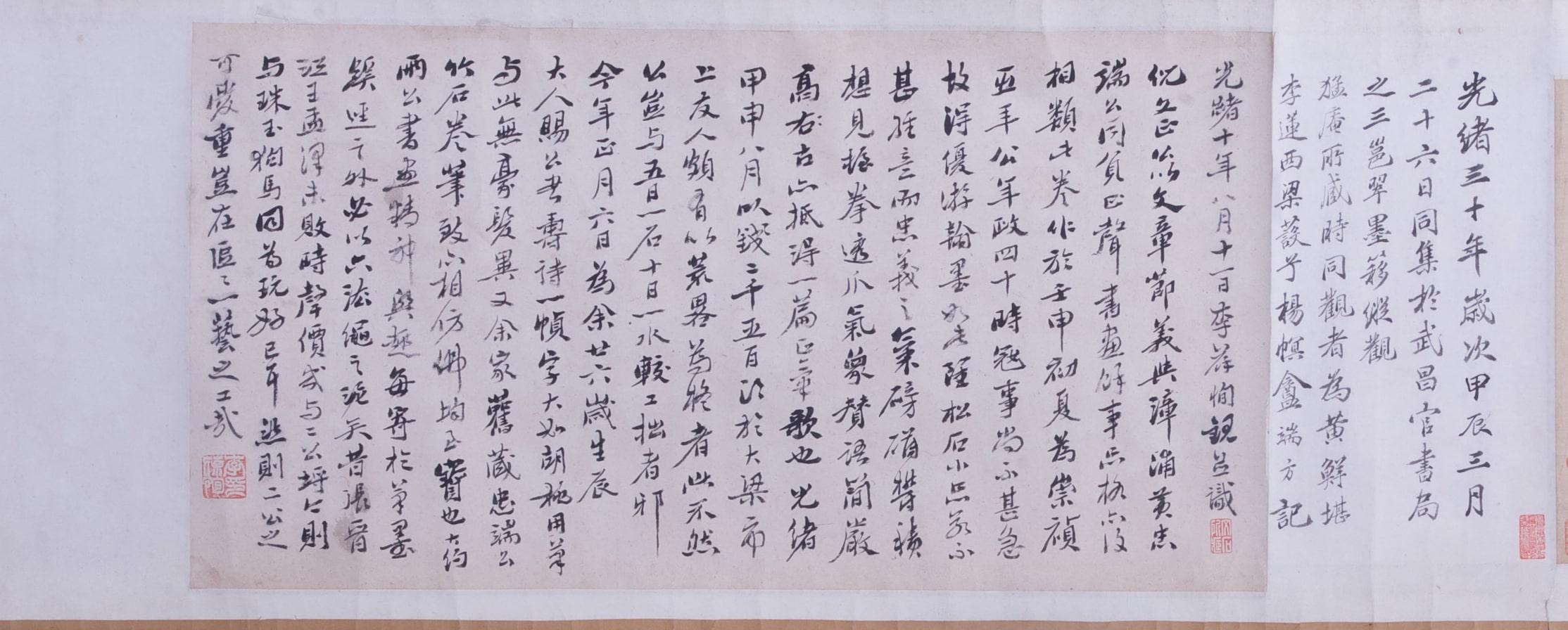 在后面跋文与画幅中间还有题文,文字内容为“光绪三十年岁次甲辰三月二十六日,同集于武昌官书局之三邕翠墨簃,纵观猛庵所藏,时同观者为黄鲜堪、李莲西、梁蔎子、杨幎盦,端方记”。光绪三十年为1904年,应该是李葆恂最后跋记又过两年,端方与友人聚于李葆恂武汉的书斋同观此画所记。端方即“托忒克·端方(1861年—1911年),字午桥,号陶斋,清末大臣,金石学家。满洲正白旗人,官至直隶总督、北洋大臣。”