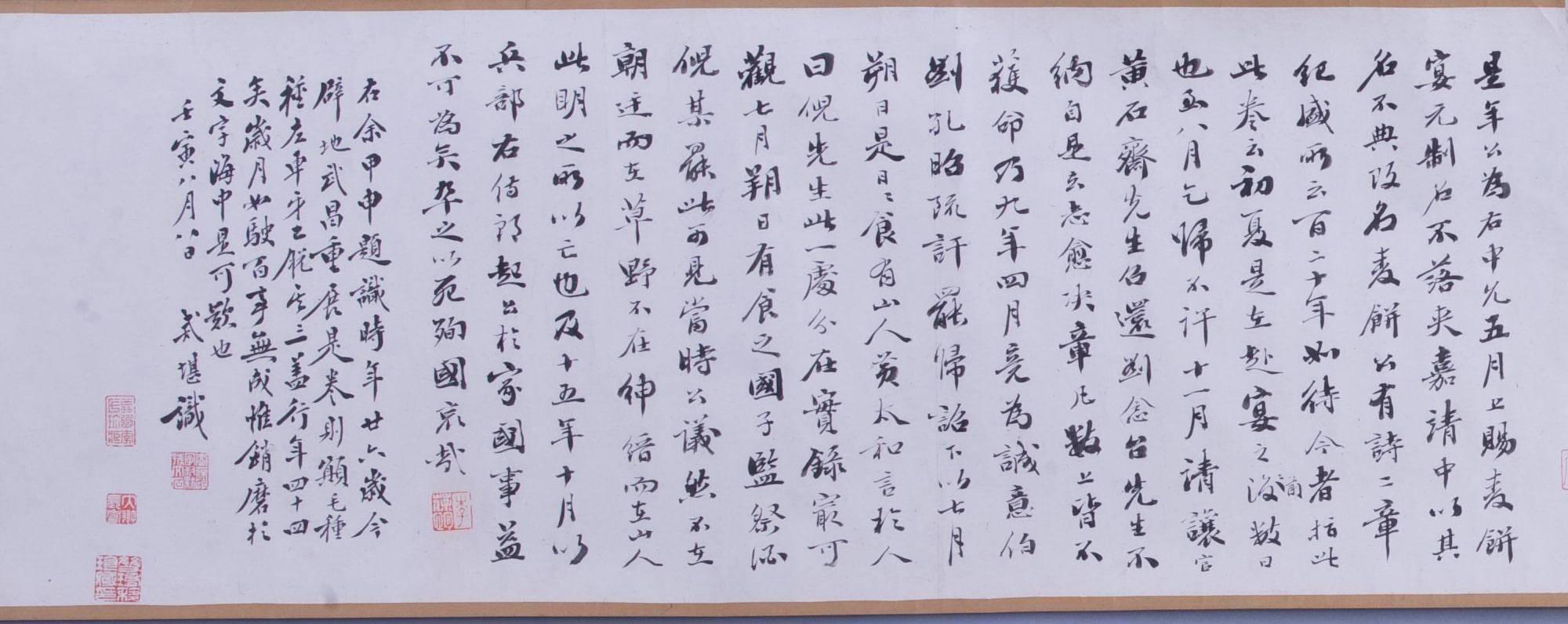 此手卷除画幅外还有引首和数段跋文。引首有题:“岳气星精” 厚如先生嘱,蠲叟敬题。据考“厚如先生”或为苏宗仁,苏宗仁又名苏厚如,北京人(原籍安徽黄山市黄山区)。著名收藏家、文物鉴赏家。收藏甚丰。其中捐献给中国历史博物馆的“北宋百一砚”影响最大。“蠲叟”为“马一浮(1883~1967),幼名福田,字一佛,后字一浮,号湛翁,别署蠲翁、蠲叟、蠲戏老人。浙江会稽(今浙江绍兴)人,中国现代思想家、诗人和书法家。”他是浙江大学原教授,引进马克思《资本论》的中华第一人,与梁漱溟、熊十力合称为“现代三圣”(或“新儒家三圣”),现代新儒家的早期代表人物之一。马一浮于古代哲学、文学、佛学造诣精深,又精于书法,合章草、汉隶于一体,自成一家。曾应蔡元培邀赴北京大学任教。建国后,任浙江文史研究馆馆长、中央文史研究馆副馆长。
