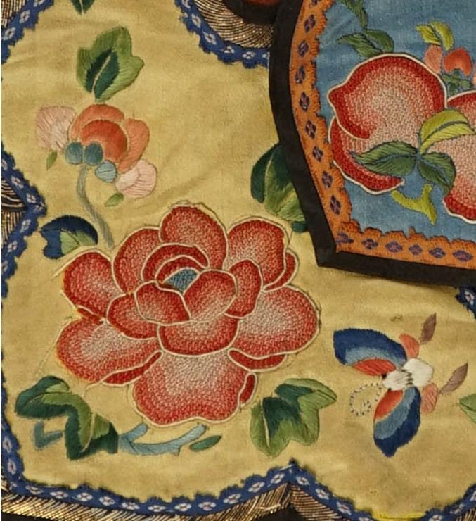 中间一层以黄色缎为地,用打籽绣法在胸前的如意头内绣制伞盖纹样,其余三个如意头内装饰牡丹花纹样,主纹周围采用套针、戗针等针法绣制蝴蝶及四季花卉图案;