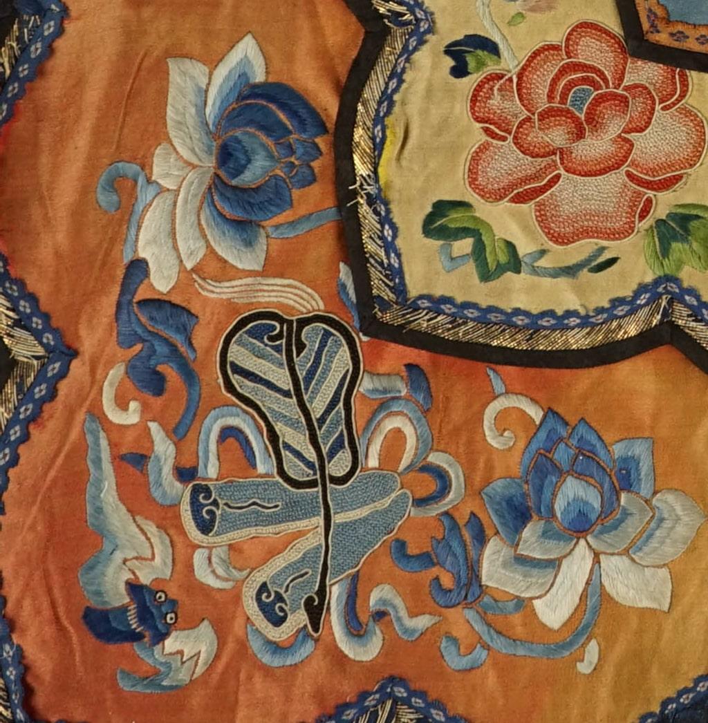 最下层为红色缎地,采用三蓝配色,以打籽绣法绣制“暗八仙”图案,即鱼鼓、宝剑、笛子、荷花、葫芦、扇子、花篮、玉板,用其代表道教中的八仙,寓意吉祥。暗八仙周围以戗针、套针等针法绣制四季花卉及蝙蝠纹样,象征四季常青,福寿安康。整件云肩色彩秀丽典雅,绣工细密整洁,堪称清代云肩中的佳品。