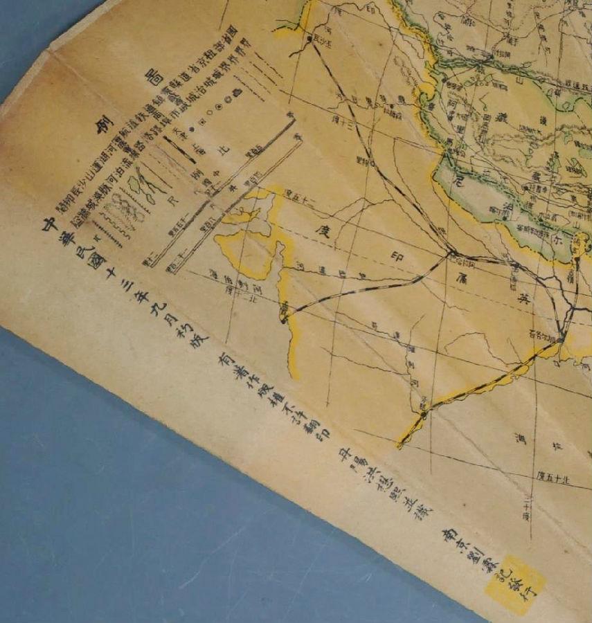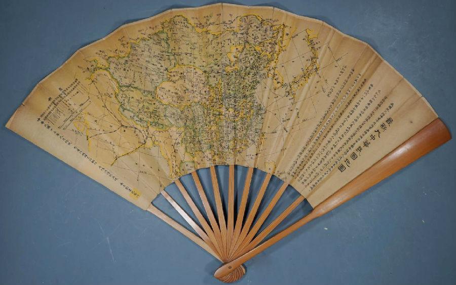 北京艺术博物馆藏民国地图成扇一柄,竹制扇骨。正面为彩色《最新大中华民国地图》,图中比例尺分别以中国尺和英尺标注。图末“中华民国十三年九月初版有著作版权不许翻印 丹阳洪懋熙并识 南京刘霖记发行”,可知该扇印制时间为1924年,制图者为民国时期著名地图出版家洪懋熙。