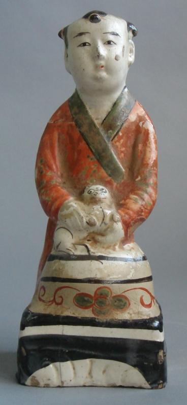 红绿彩是指以铅作为助熔剂的低温彩绘瓷。它是金代北方民窑较为流行的装饰品种之一,烧造地域广泛,窑场众多,并涌现出了磁州窑、当阳峪窑、长治窑、淄博窑等红绿彩瓷名窑。从窑址出土的标本看,金代红绿彩瓷器的造型十分丰富。除了盘、碗类的日常生活器皿外,还有人物俑、动物俑以及佛像等。特别是那些制作工艺精湛、色彩鲜亮明快、形象生动活泼的童子像,更是深受人们的无比厚爱。