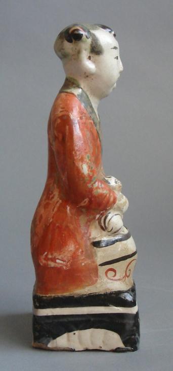 馆藏这件红绿彩童子像,底径5.7×7厘米,高17.5厘米。童子双手捧一小动物立于台座后。台座呈鼓凳形,上圆下方,更增强了瓷塑的立体效果。(图1、图2、图3)童子圆脸,以黑彩绘眉眼,红彩画小口,神态天真淳朴。头上的发式非常独特,整体分为前、左、右三区,分别以红色的头绳扎起,形成三个小髻。身上所穿的衣服更是颇具民族风格,其为左衽交领窄袖式长衣,除了领襟部饰黑边绿彩外,整体遍施红彩,色调浓艳。(图4)