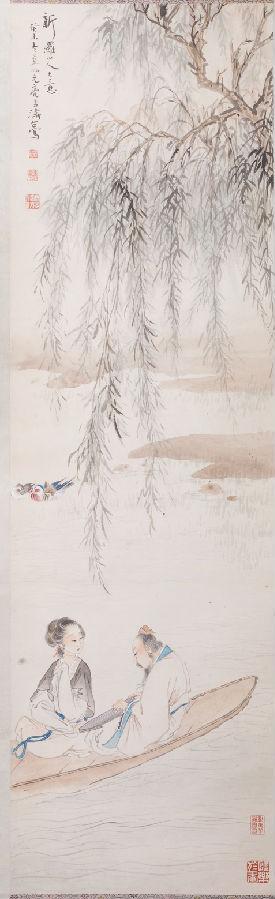 图中山水应为周元亮所绘,画家以质朴的笔触,描绘了湖边浅滩,杨柳依依的场景,笔意松弛,墨色浓淡相宜;湖中一对璧人应出自徐燕孙的手笔,扁舟上女子妩媚娇艳,含情脉脉地回眸望向专心抚琴的男子。画中人物衣纹简洁、精细,和湖边杨柳枝叶的繁杂形成鲜明对比。王雪涛笔下的一对鸳鸯在湖中戏水,色墨和谐,意趣盎然,点明画作寓意夫妻恩爱。徐燕孙与王雪涛、周元亮等人在1940年前后来往密切,这一时期的许多作品都见证了三人的友谊,如此幅1943年冬合作的山水人物镜心。