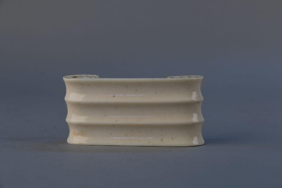 墨床通常被归类为文房器中的墨之属,是研墨时置放墨块儿的用具,清代较为流行。其造型多小巧精致,一般为长方几式或书卷式,或方或圆,或船式等,形式多样。清代墨床的材质丰富,多见瓷、玉石、玛瑙、玻璃、珐琅、竹木牙雕等,以珍贵材质精工细作的墨床并不具有实际使用功能,而是典型的书案清供陈设。馆藏象牙五福捧寿卷足墨床是一件将牙雕技法与文房清供题材相结合的艺术品。初看其造型别致,纹饰素雅,细细看来五福捧寿的纹样又增添了几分吉祥美好的寓意。