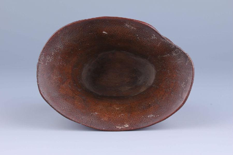 明清时期,金陵(今南京)、嘉定(今属上海)是竹刻艺术的中心,名家辈出,各创一格。其中嘉定竹刻作为中国竹刻史上最大的流派,为明代正德、嘉靖年间(公元1505年—公元1566年)朱鹤所创。他将书画艺术融入竹刻,开创了以镂雕、深雕为特征的“深刻技法”,使竹刻成为一门独立的观赏艺术。其子朱缨、其孙朱稚征均继承上辈竹刻技艺,并推陈出新。祖孙三代奠定了嘉定竹刻艺术的基本品格,在历史上被人称为“嘉定三朱”。馆藏竹根雕松树纹杯在雕刻技法上,将松树的主枝干以镂雕处理,团团松针则以阴刻手法表现,再搭配深雕而成的山石,刀法神妙,风格简洁精雅,古朴淳厚,是清代早期竹雕艺术品的代表。遗憾的是一节镂雕而成的松树枝干断裂遗失,这也反映出竹制品松脆易蛀、不好保存的特性。