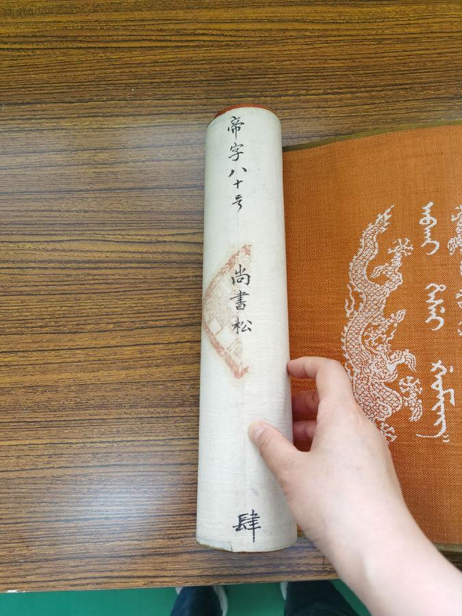 诰命卷轴长477厘米,宽31厘米,织锦地,其上布满提花祥云与仙鹤图案,首尾两端织有头尾相对的升降龙图案,相拥“奉天诰命”四字。卷轴左侧开始处从上至下书汉文“帝字八十号”、“尚书松”、“肆”等字,应为其编号文字,内夹带纸条一张,上书满文“sungyvn改sunyun”。诰命颜色自右至左依次为红、棕、乳白、褐、黑、土黄、桔红、明黄等八种。其内容以满、汉两种文字书写,笔迹颜色光彩夺目,为黄、蓝、白、绿、红、黑六色。汉文自右至左书写39行330字;满文自左至右书写,38行317字,满汉文合于中幅。结尾处题款:嘉庆元年正月初一日,松筠,加盖朱红玺印。嘉庆元年为公元1796年,距今已225年。是年正月初一日,乾隆帝举行禅位大典,颙琰继帝位,即嘉庆皇帝,礼成颁诏天下。松筠父母诰命正是此次覃恩封赠的产物。