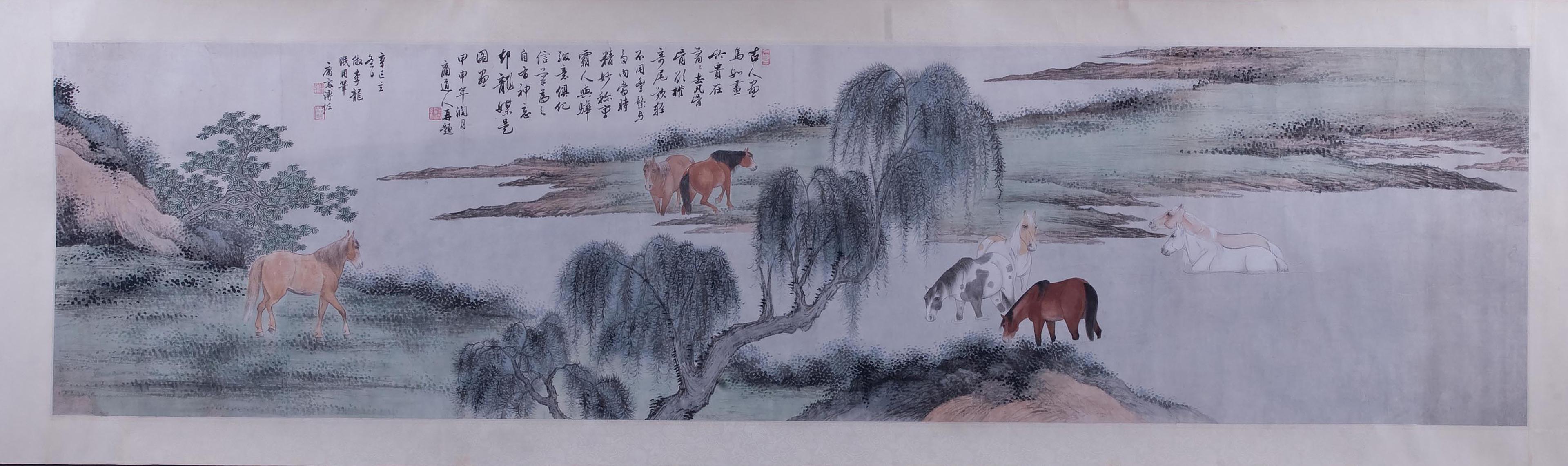 溥佐山水八骏图横幅