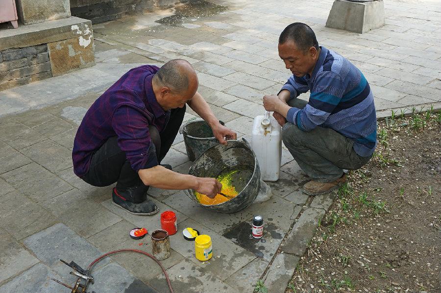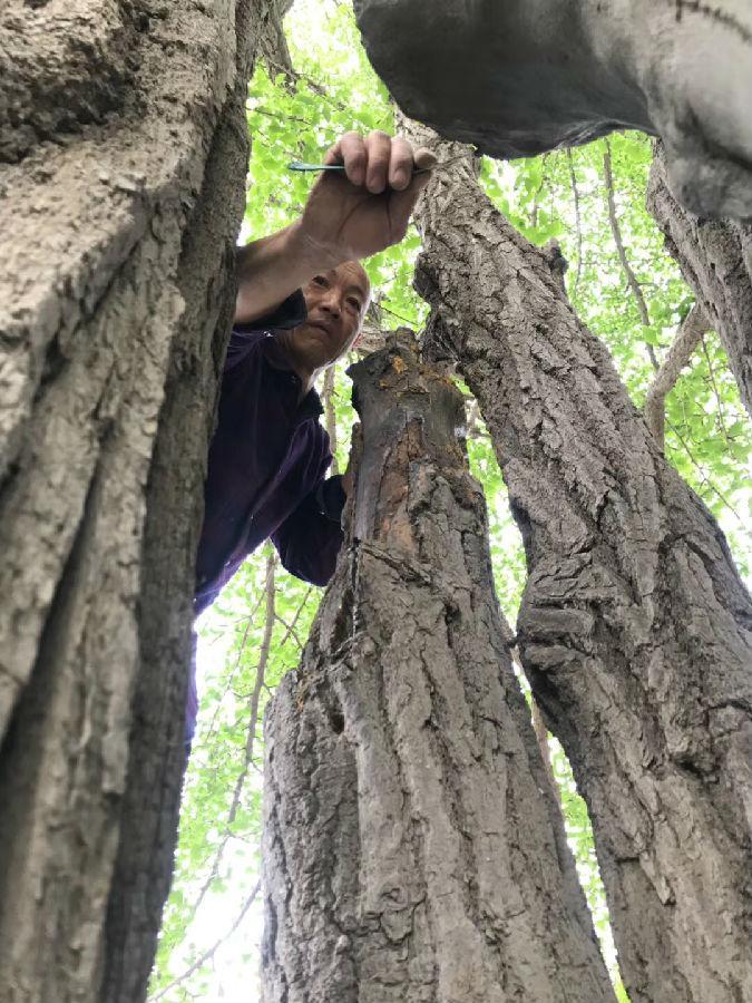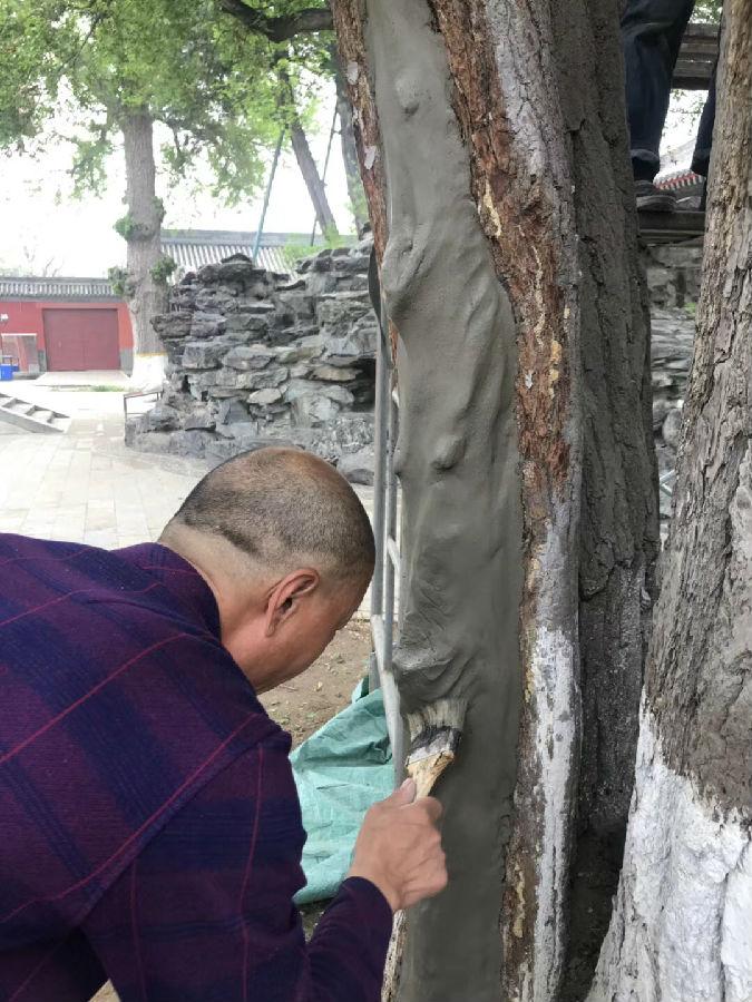 古树维护杀虫除糟朽之后要用水泥封上伤口。雕刻封口水泥,让它们与真的树干融为一体,王师傅做的得心应手,没有CAD制图、没有美工师设计、没有“专家批复的方案及修改意见”,哪里该模拟树皮,哪里该模拟树干,一双劳动的手一把刻水泥的刀,把根瘤、断枝、风化的年轮、干裂的树皮模拟得惟妙惟肖。水泥干后再做防水和涂色。实践出真知,社会大课堂,令人敬佩!
