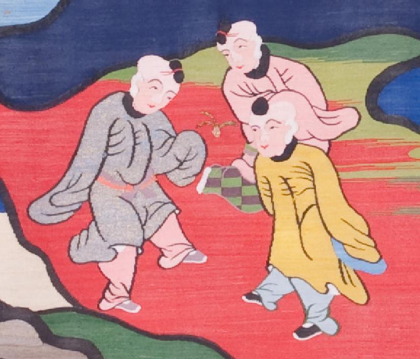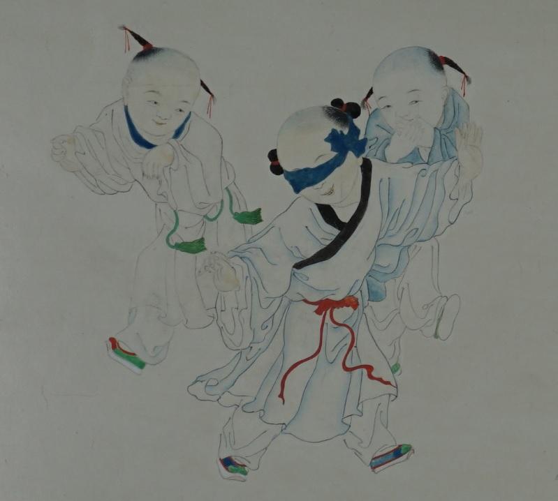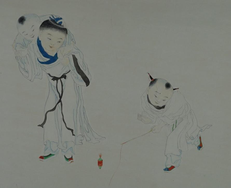 这三个小朋友正在踢毽子,这也是我国的一项传统体育活动。始于汉代,到了明清时期,这个游戏更加流行。《帝京岁时纪胜》记载:“手舞脚踏,不少停息,若首若面,团转相帮,随其高下,动合机宜,不致堕落”。
