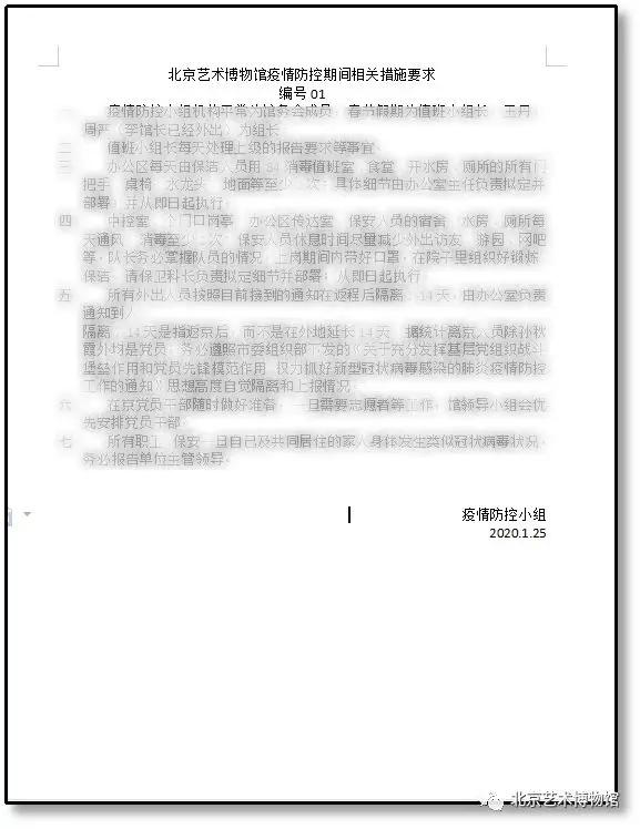 1月25日鉴于疫情严重,我馆成立疫情防控小组,制定《北京艺术博物馆疫情防控期间相关措施要求 编号01》部署防疫期间工作。26日鉴于北京已经启动重大突发公共卫生事件一级响应,我馆又制定《北京艺术博物馆疫情防控期间相关措施要求编号02》对相关工作进行了严格要求。