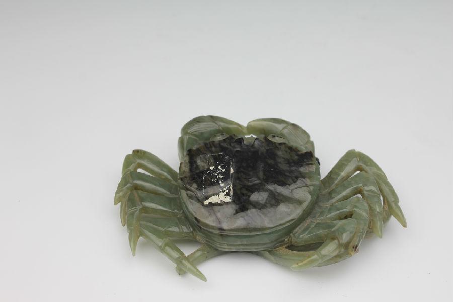以白玉雕刻螃蟹实在是奢华,馆藏清代白玉圆雕蟹,玉质纯净、玉色均匀,是难得的精品。螃蟹以一块白玉料圆雕而成,长12.3厘米、宽8.3厘米、高2.2厘米,并附有木座。螃蟹整体呈伏卧爬行状,双螯合置于身体前端;蟹腿一侧舒展一侧蜷缩作爬行状,左边的蟹腿处镂雕一根细长芦苇叶似螃蟹正爬过荷塘。蟹壳上缘凸雕螃蟹的圆眼睛,表面琢制出凹凸不平的质感,腹部以阴刻线琢刻蟹的嘴和尖脐,蟹螯、蟹腿、蟹壳背面均施以一组组短阴刻线表示蟹的绒毛。整体琢刻极为写实。