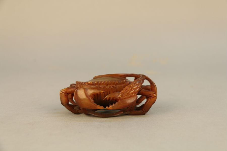 螃蟹在中国古代便是一道美食,品蟹、饮酒、赏菊、登高等是古人秋季重要的社交活动。明清时期,螃蟹的寓意得到升华,成为文人绘画和工艺品雕刻的重要题材之一。绘画螃蟹或摆放螃蟹造型的摆件于书房案头,即寓意了考取科举功名的美好愿望,又是文人对自然野趣的追求。在北京艺术博物馆众多的明清工艺品中,出现了不少螃蟹的形象。它们材质不同、形态各异,或动或静、具有艺术表现力,体现了当时人们的思想生活和审美意趣。