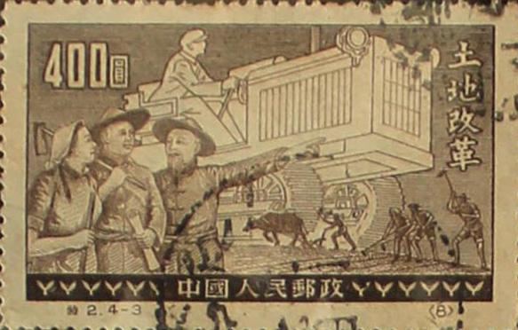 1952年1月1日发行的《特2—土地改革》邮票一套4枚,紧密配合当时全国土地改革。邮票的主图案背景是一台正在作业的巨型拖拉机,衬托前景分得土地的、怀着无限喜悦的农民,以满腔的热情在自己的土地上辛勤耕作的情景。