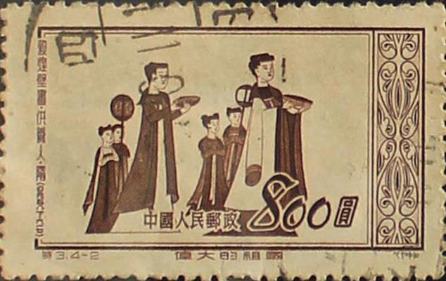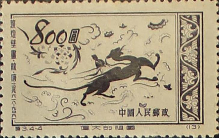 敦煌壁画是我国的文化瑰宝,在老特票里自然也少不了敦煌题材。《特3—伟大的祖国(第一组)敦煌壁画》于1952年7月1日发行。分别为1、狩猎·魏;2、供养人·隋;3、飞天·唐;4、乘虎天人·唐。其中1、2两张邮票反映了当时人们的现实生活,图案生活气息很浓。3、4则反映当时人们的精神世界,画面显得空灵、洒脱。