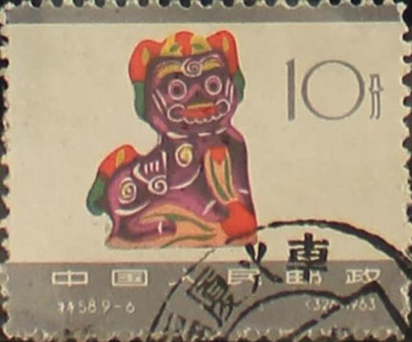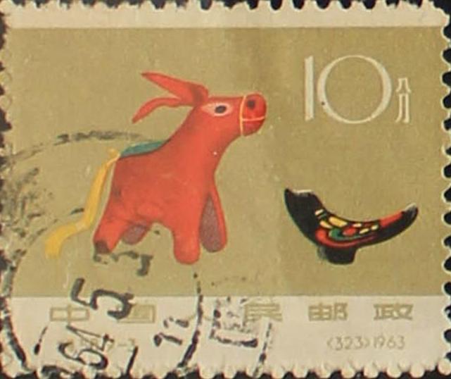 1963年12月10日发行的《特58—民间玩具》,一套9枚,北京艺术博物馆收藏其中8枚。民间玩具作为中国民间工艺美术的一种独特的艺术形式,不仅富有浓厚的民俗趣味和生活气息,还带有浓厚的地方特色。分别为:1、泥塑-鸡(无锡)和泥塑-羊(北京);2、泥塑-春牛(上海);3、布艺-驴(蚌阜)和泥塑-鸟(青岛);4、布艺-骆驼(北京);5、布艺-白兔(北京)、木-棒棒人(邯郸)和泥塑-公鸡(北京);6、泥塑-狮子(天津);7、布艺-小虎(青岛)和布艺-大虎(北京);8、麦秸-花公鸡(上海)