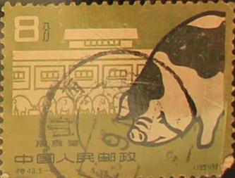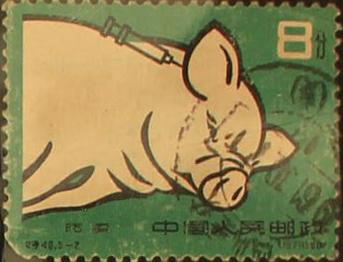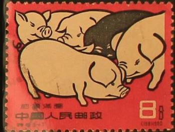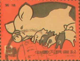 发行于1960年的《特40—养猪》特种邮票,一套5枚。分别是:繁殖、防疫、肥猪满圈、猪食堂、肥猪满仓。这套邮票的五幅图案分别采用了不同颜色作为主基调,展现养猪事业的蓬勃发展。图中猪的形象,身体圆润、神态各异,给人一种生活温馨和幸福的感觉。