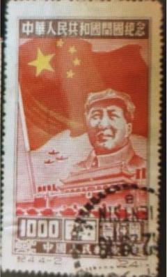 1950年7月1日发行。图案为天安门前庆祝开国典礼大阅兵的场面,以飘扬的五星红旗为背景,红旗中央为开国领袖毛泽东头像。邮票全套为4枚,面值分别为800元、1000元、2000元、3000元。我馆收藏的为其中两枚。