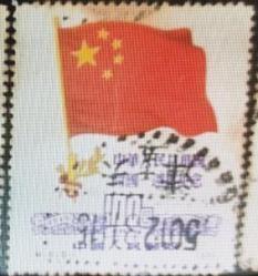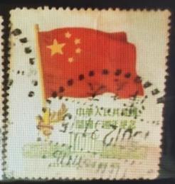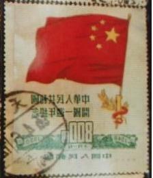 1950年10月1日发行,这是新中国第一次出现的国庆题材邮票,邮票全套共5枚,面值为100元(紫)、400元(红)、800元(绿)、1000元(黄)、2000元(蓝)。图案为五星国旗,寓意新生的共和国欣欣向荣,在中国共产党的领导下的全国各族人民大团结。旗杆上红色飘带系着数字1,表示中华人民共和国成立一周年;国旗下方为“中华人民共和国成立一周年纪念”字样。