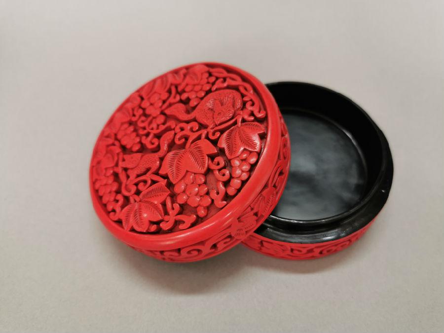 以北京艺术博物馆藏清代木嵌螺钿松鼠葡萄纹印盒为创意来源,采用传统雕漆工艺制作。松鼠与葡萄的纹饰寓意祥和福气,有“多子多福”、“子孙万代”的吉祥祈愿,展现了富足丰盛的生活画卷,是明清时期常见的装饰题材之一。